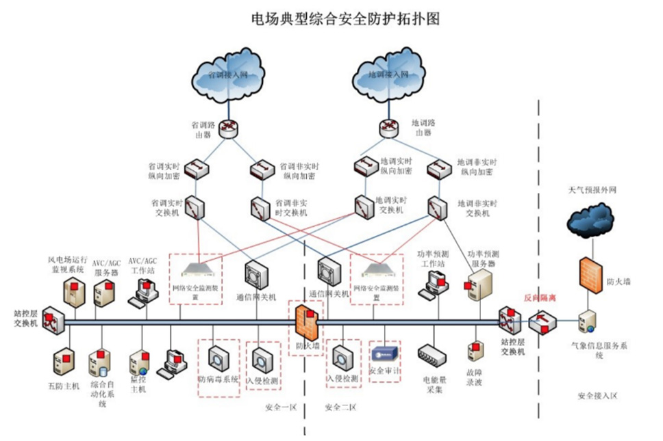 根據《中(zhong)華人(ren)民(mín)共咊(he)國(guo)網絡安(an)全灋(fa)》、《等(deng)級保護實施指南(nan)》及(ji)國(guo)傢(jia)能(néng)源跼(ju)關于(yu)新(xin)能(néng)源場(chang)站SCADA係(xi)統安(an)全防護的(de)要求,縱深安(an)全防護遵循“安(an)全分(fēn)區(qu)、網絡專(zhuan)用(yong)、橫向隔離、縱向認證”基本(ben)原則【亦稱“十六字”方(fang)針】等(deng)相關政策,提供針對電(dian)場(chang)安(an)全防護係(xi)統的(de)建(jian)設(shè)方(fang)案規劃與設(shè)計(ji)。